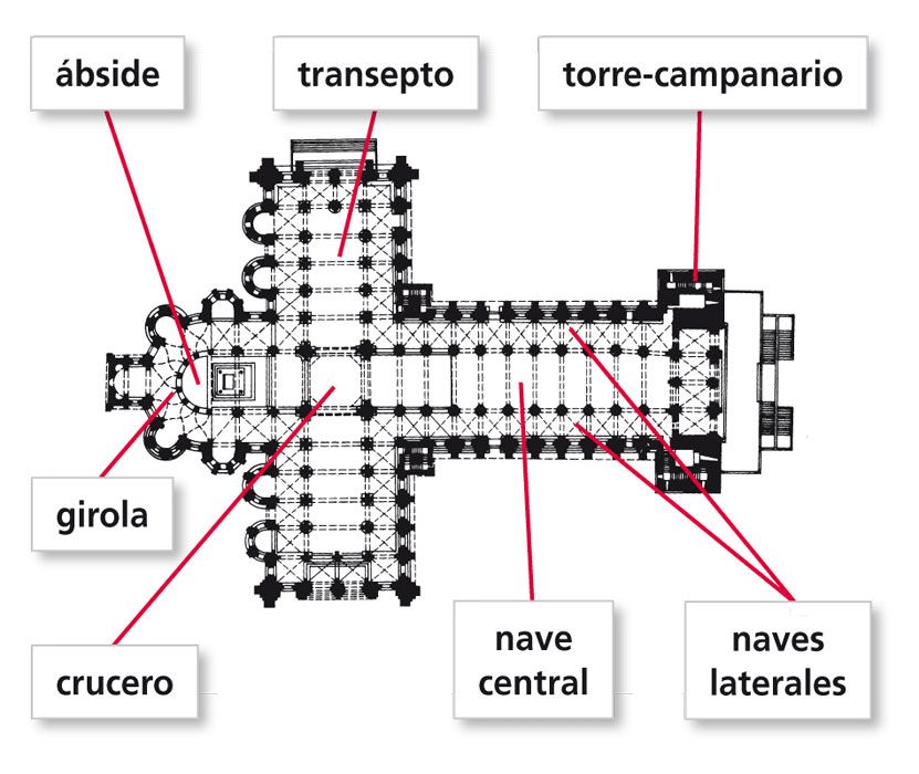 - Lorsque le temple a plus d'une nef, si les côtés se retournent derrière la chapelle principale, cette partie constitue le déambulatoire ou déambulatoire. À la tête de l'église, il y a généralement des absides semi-circulaires, celle du centre étant plus grande. Dans les églises à ambulatoire, il y a généralement des chapelles radiales.
