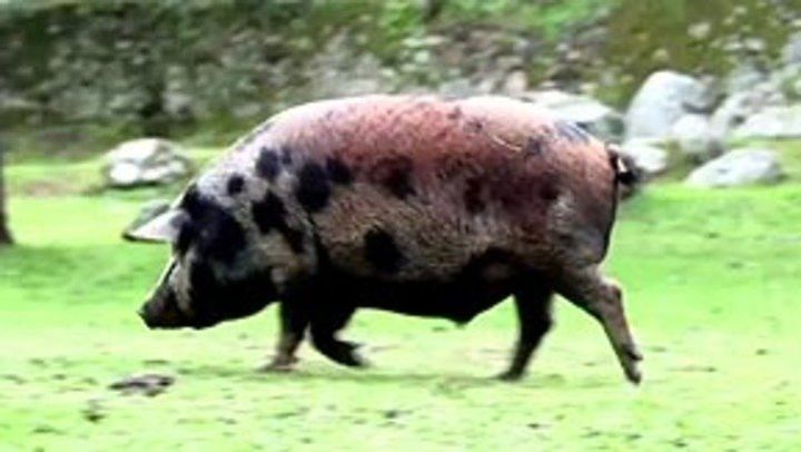 - Cerdos Manchados: Los manchados, de estirpe Manchado de Jabugo o simplemente Jabugo, se encuentra en peligro de extinción. Criado principalmente en las sierras de Huelva, su color es claro con manchas uniformes repartidas por el cuerpo de color gris o negro, es de donde proviene el delicioso jamón de jabugo. Su tamaño varía entre 120 kilos a 190 kilos sin problema.