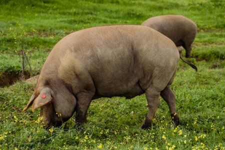 - Precinto verde: Son los de cebo de campo. En su fase final de engorde se alimentan de piensos (trigo, cebada, maíz... ) y pastos naturales porque pastan en libertad, pero no comen bellotas. No existen cerdos de cebo de campo 100 % ibéricos.